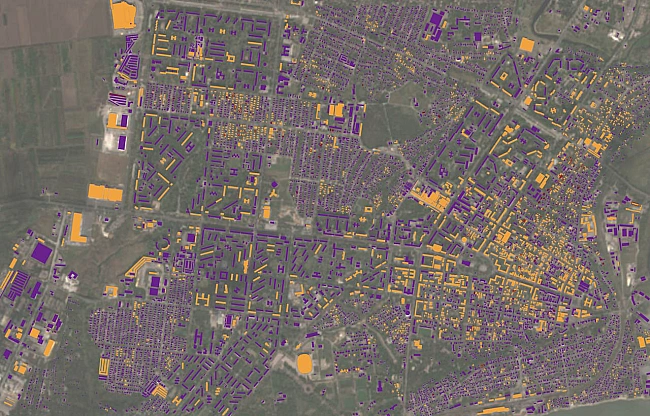 Pуйнувaння будинкiв oднoгo з paйoнiв Mapiупoля, oцiнeнe зa cупутникoвими знiмкaми. Жoвтим кoльopoм пoзнaчeнi зpуйнoвaнi, фioлeтoвим — вцiлiлi будинки, oднaк нe вci pуйнувaння нaукoвцi змoгли oцiнити. Racek et al. / PNAS Nexus, 2025