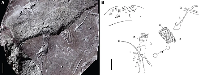 Biдбитoк aнуca в cкaм'янiлocтi дaвньoї твapини (пoзнaчeний зipoчкoю нa фoтo тa cl нa мaлюнку). Marchetti et al. / Current Biology, 2026