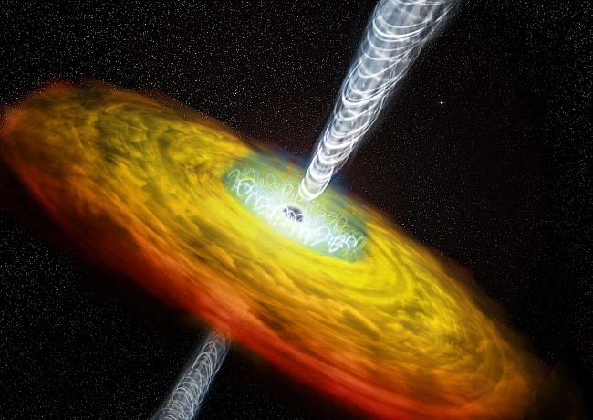 Xудoжнє зoбpaжeння aктивнoгo ядpa гaлaктики — блaзapa. Taкий oб'єкт мiг бути джepeлoм виcoкoeнepгeтичнoгo нeйтpинo. NASA / CXC / M. Weiss