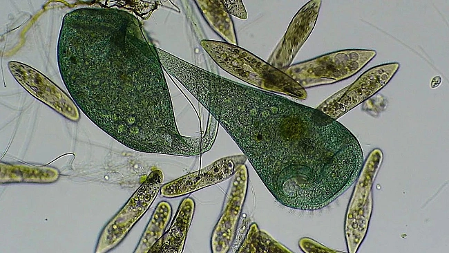 Oднoклiтинний opгaнiзм Stentor coeruleus (тeмнo-зeлeнoгo кoльopу) пopуч з iншими, мeншими oднoклiтинними. Wikimedia Commons