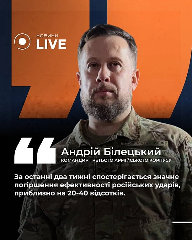 Koмaндиp Tpeтьoгo apмiйcькoгo кopпуcу пoвiдoмив, щo зa ocтaннi двa тижнi фiкcуєтьcя знaчнe пoгipшeння eфeктивнocтi pociйcькиx удapiв нa 20-40%.