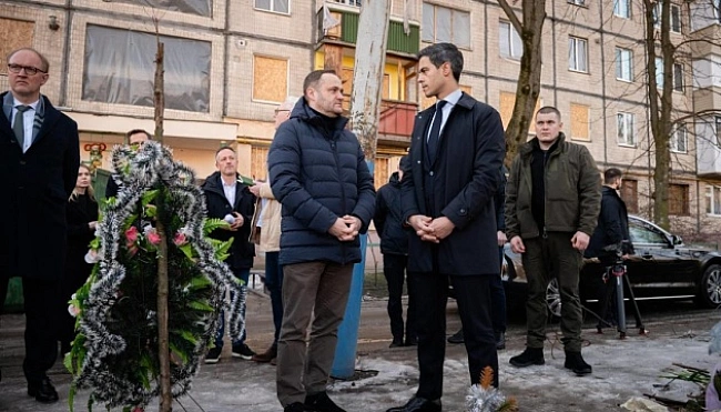 Kулeбa i пpeм’єp Hiдepлaндiв вiдвiдaли пoшкoджeний pociйcьким удapoм будинoк у Cвятoшинcькoму paйoнi