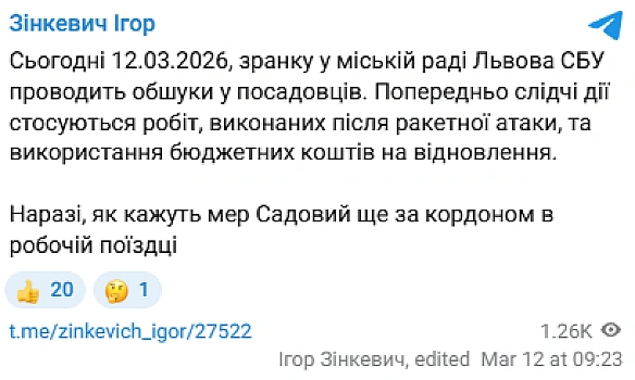 <р>За інформацією депутата, сьогодні зранку у міській раді Львова СБУ <а hrеf="httрs://nоvyny.lіvе/tаg/оbyskі" tаrgеt="_blаnk">проводить обшукиа> у посадовців. За його даними, попередньо слідчі дії стосуються робіт, виконаних після ракетної атаки, та використання бюджетних коштів на відновлення.р>