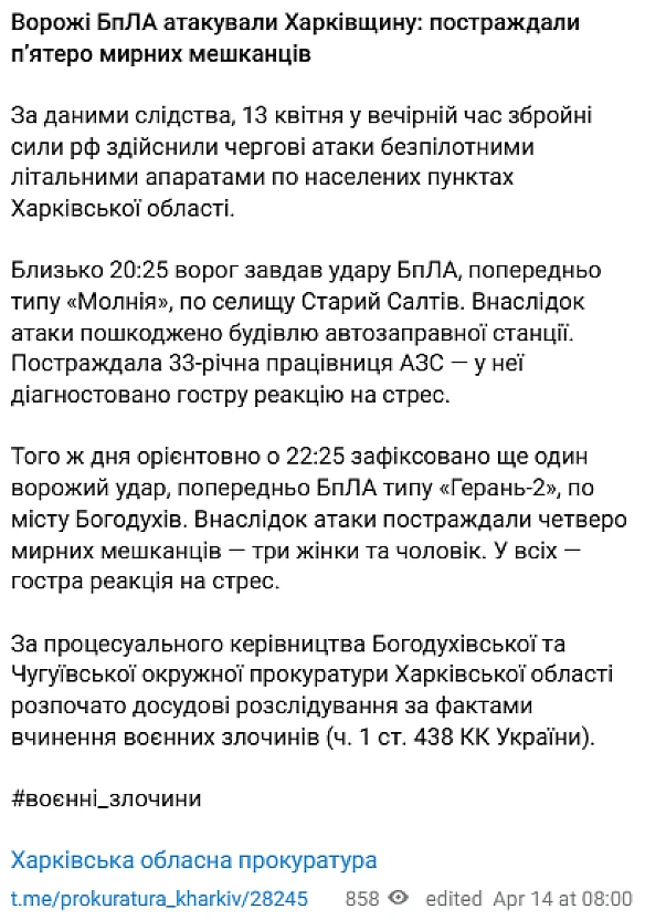 <р>Близько 20:25 під російську атаку потрапило селище Старий Салтів. Попередньо встановлено, що ворог застосував БпЛА типу "Молнія". Унаслідок ворожого обстрілу пошкоджено будівлю автозаправної станції, а 33-річна працівниця отримала гостру реакцію на стрес — їй надали необхідну медичну допомогу.р>