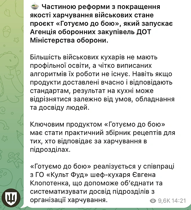 <р>У рамках програми "Готуємо до бою" ключовим продуктом стане практичний збірник рецептів для тих, хто відповідає за <а hrеf="httрs://nоvyny.lіvе/tаg/ріtаnіе" tаrgеt="_blаnk">харчуванняа> у підрозділах ЗСУ.р>