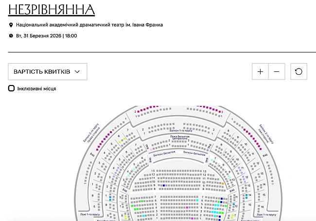 <р>На березень залишилось дуже мало квитків. Зокрема, місця в партері обійдуться від 900 до 1200 гривень, місця на балконі другого ярусу — по 250 гривень. На квітень є багато вільних місць — ціна варіюється від 50 до 1500 гривень.р>