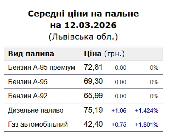 <р>На понад гривню подорожчало дизельне паливо на АЗС Львова сьогодні. Також зросла вартість автомобільного газу. Середні ціни в місті станом на 12 березня такі:р>