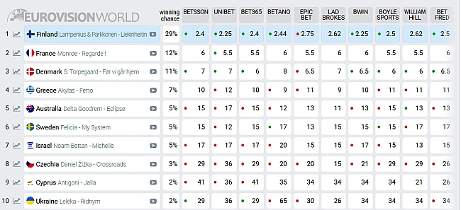 <р>Варто зазначити, що ще на початку сезону Україна була значно вище в букмекерських таблицях. Наша країна входила до трійки фаворитів, поступаючись лише Ізраїлю та Швеції. Тоді букмекери оцінювали шанси України приблизно у 7%, однак після нацвідборів та появи нових конкурсних заявок позиція почала знижуватися. До прикладу, ще 12 березня Україна була на 9 сходинці, тоді як сьогодні посунулась на 10 місце. р>