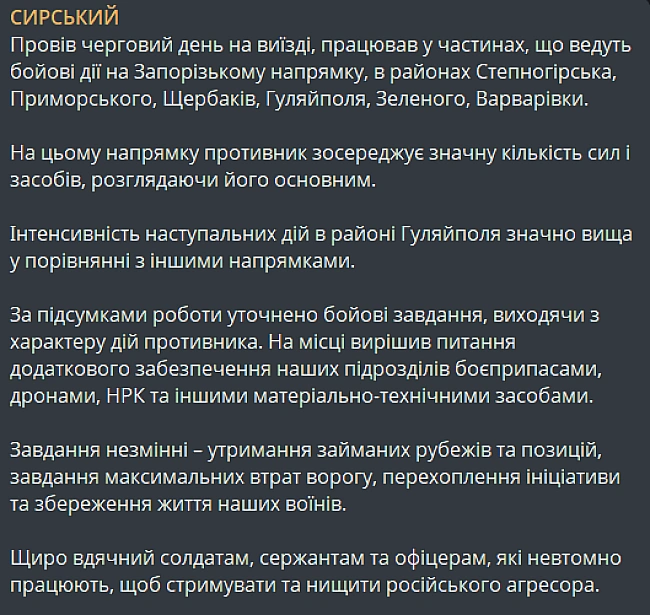 Скриншот допису Олександра Сирського