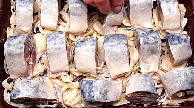 <р>Скумбрію помити, очистити від нутрощів і чорної плівки всередині, після чого нарізати порційними шматочками. Цибулю нарізати півкільцями.р>