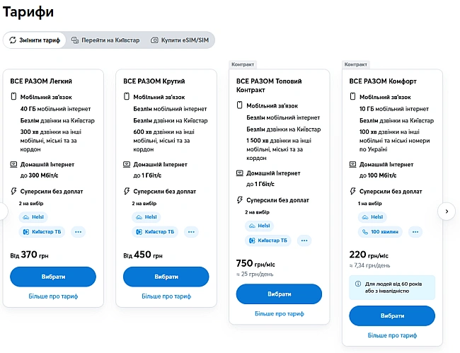 Доступні тарифи. Фото: Скриншот/Київстар