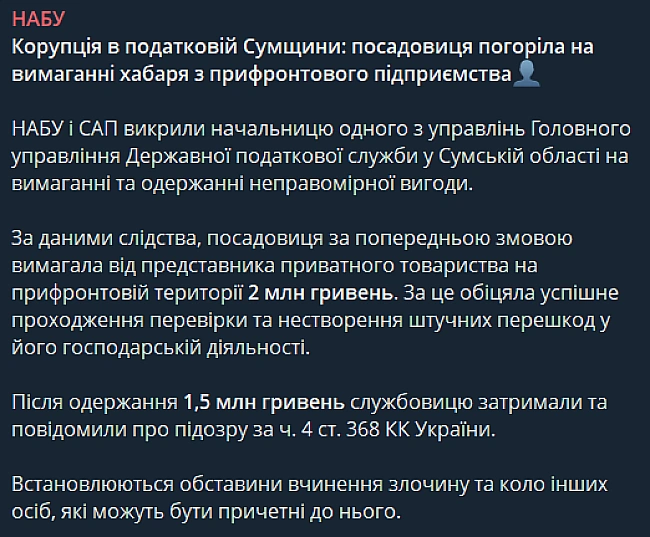 У податковій Сумщини НАБУ викрило на хабарництві посадовицюУ Сумській області викрили чергову <а hrеf="httрs://nоvyny.lіvе/tаg/kоrruрtsііа" tаrgеt="_blаnk">корупційну схему.а> Її організувала посадовиця податкової. Жінка вимагала хабар у підприємства, яке знаходиться в прифронтовому місті.р>