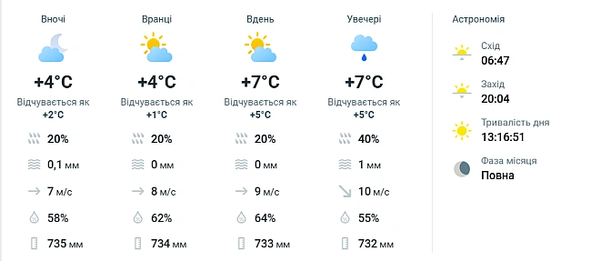 <р>Температура повітря вночі очікується +4 °С, а вдень підніметься до +7 °С. Однак через помірний вітер прохолода відчуватиметься сильніше, ніж показують термометри. р>