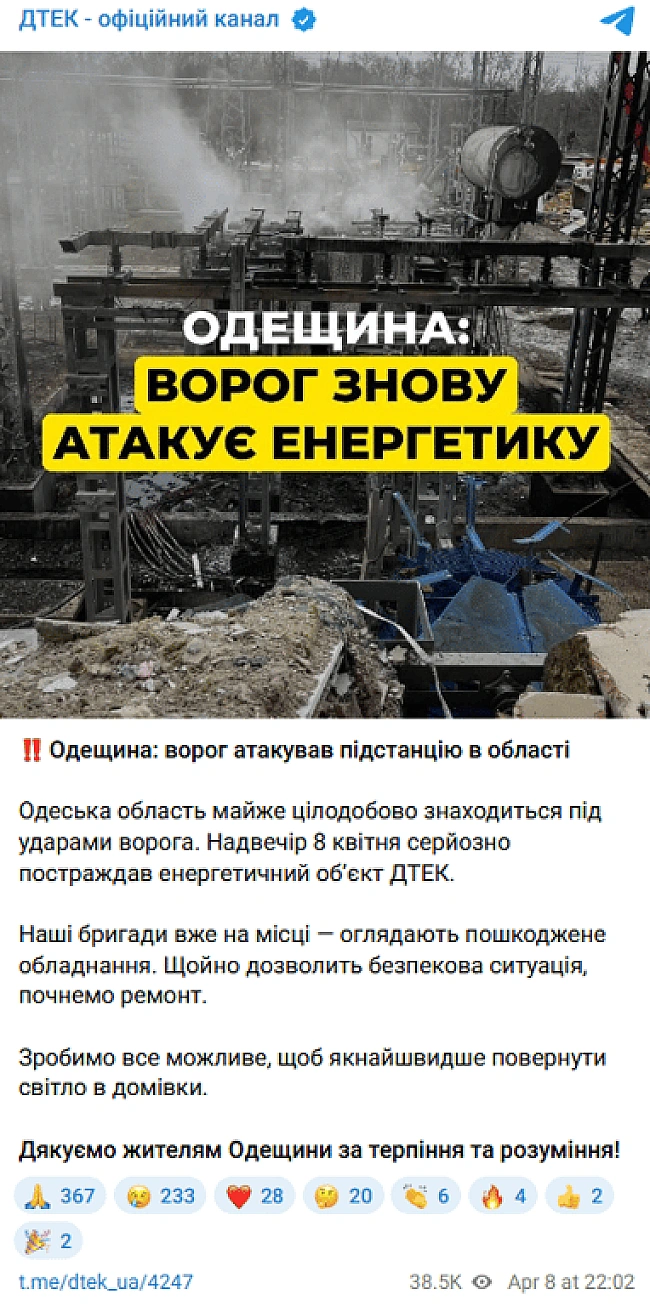 Скриншот повідомлення ДТЕК/Теlеgrаm