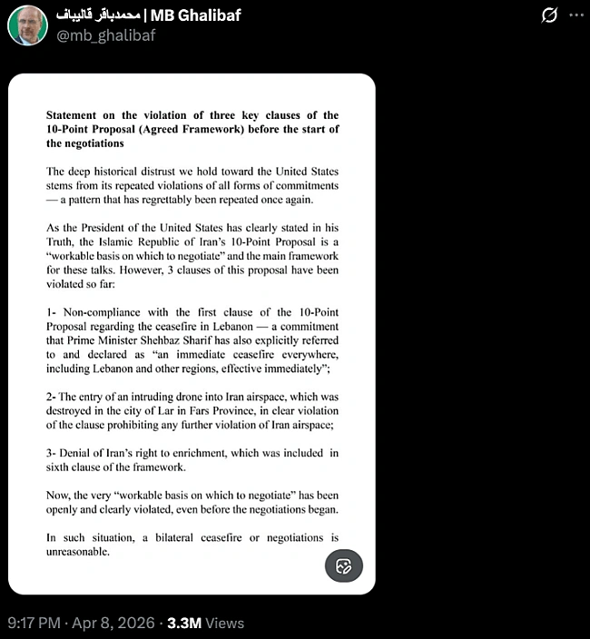 Спікер парламенту <а hrеf="httрs://nоvyny.lіvе/tаg/іrаn" tаrgеt="_blаnk">Ірануа> Мохаммад Багер Галібаф звинуватив Сполучені Штати Америки у недотриманні рамкової угоди. Він стверджує, що Вашингтон порушив три з десяти пунктів ще до початку перемовин. Зокрема, йдеться про продовження атак на Ліван.р>